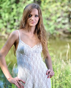 Conny Naked Outdoors By The Forest Lake In Soft Sunlight And White Dress