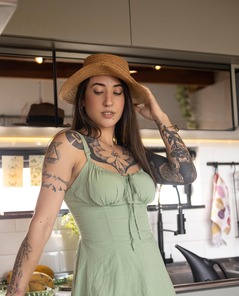 Tattooed Beauty In Green Dress Esmeraldah Teasing In Her Kitchen