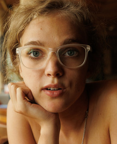 Xena Khrabry Teasing In A Cozy Cafe Wearing Glasses And Denim